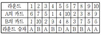 두 사람 A와 B는 1부터 10까지의 숫자가 하나씩 적힌 열 장의 카드로 ‘게임’을 한다. 게임은 총 열 번의 ‘라운드’로 구성되고, 각 라운드 마다 자신이 가지고 있는 카드 중 하나를 제시하고, 한 번 제 시한 카드는 버린다. 게임 승패는 다음과 같이 결정된다.